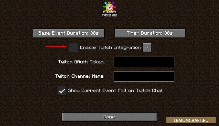 Для правильной работы мода нужно произвести отключение или настройку параметра "Enable Twitch integration" , как показано на скриншоте.